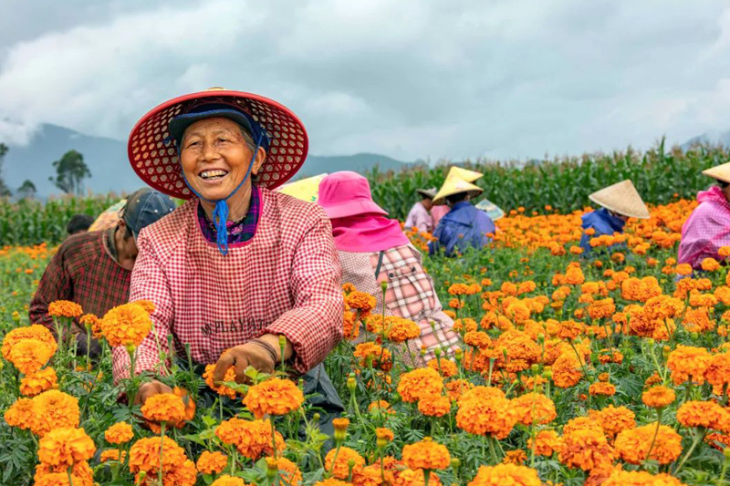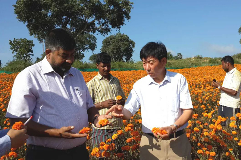 晨光生物公司原料種植基地農(nóng)民喜摘萬(wàn)壽菊。